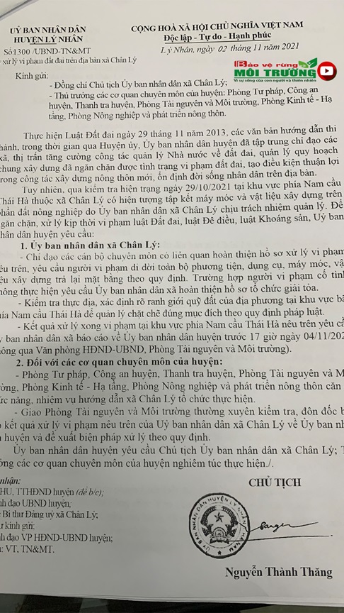Ngày 02/11/2021 UBND huyện Lý Nhân đã ban hành văn bản số 1300/UBND-TN&MT về xử lý vi phạm đất đai trên địa bàn xã Chân Lý. Trong văn bản nêu kiểm tra hiện trạng ngày 29/10/2021 tại khu vực phía Nam cầu Thái Hà thuộc xã Chân Lý có hiện tượng tập kết máy móc và vật liệu xây dựng trên phần đất nông ngiệp do UBND xã Chân Lý chịu trách nhiệm quản lý.