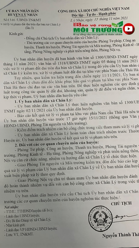 Tiếp đó, do chưa đôn đốc để khắc phục hậu quả vi phạm đất đai tại khu vực phía nam cầu Thái Hà và chưa báo cáo kết quả thực hiện nên ngày 05/11/2021 UBND huyện Lý Nhân lại tiếp tục ra văn bản số 1318/UBND-TN&MT. Đến ngày 11/11/2021 qua kiểm tra thực thạng UBND xã Chân Lý vẫn chưa đôn đốc khắc phục hậu quả vi phạm, UBND huyện Lý Nhân tiếp tục ra văn bản số 1346/UBND-TN&MT về xử lý vi phạm đất đai trên địa bàn xã Chân Lý (lần3).