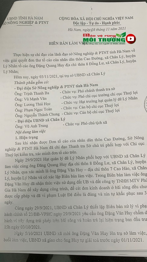 Trong biên bản làm việc ngày 03 tháng 11 năm 2021 giữa Sở Nông nghiệp và Phát triển Nông thôn tỉnh Hà Nam và UBND xã Chân Lý có nêu rõ: ông Đặng Văn Huy nhận thức được việc sử dụng đất của Ủy Ban và đất Công ty TNHH MTV Phú Gia Hà Nam để xây dựng công trình, để cát đen kinh doanh ở bãi sông đều chưa được cấp phép và đã vi phạm Luật đê điều là đúng và xin tự khắc phục sau 30 ngày.